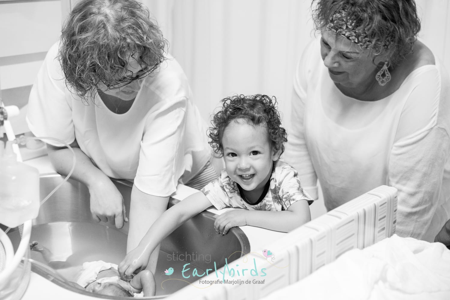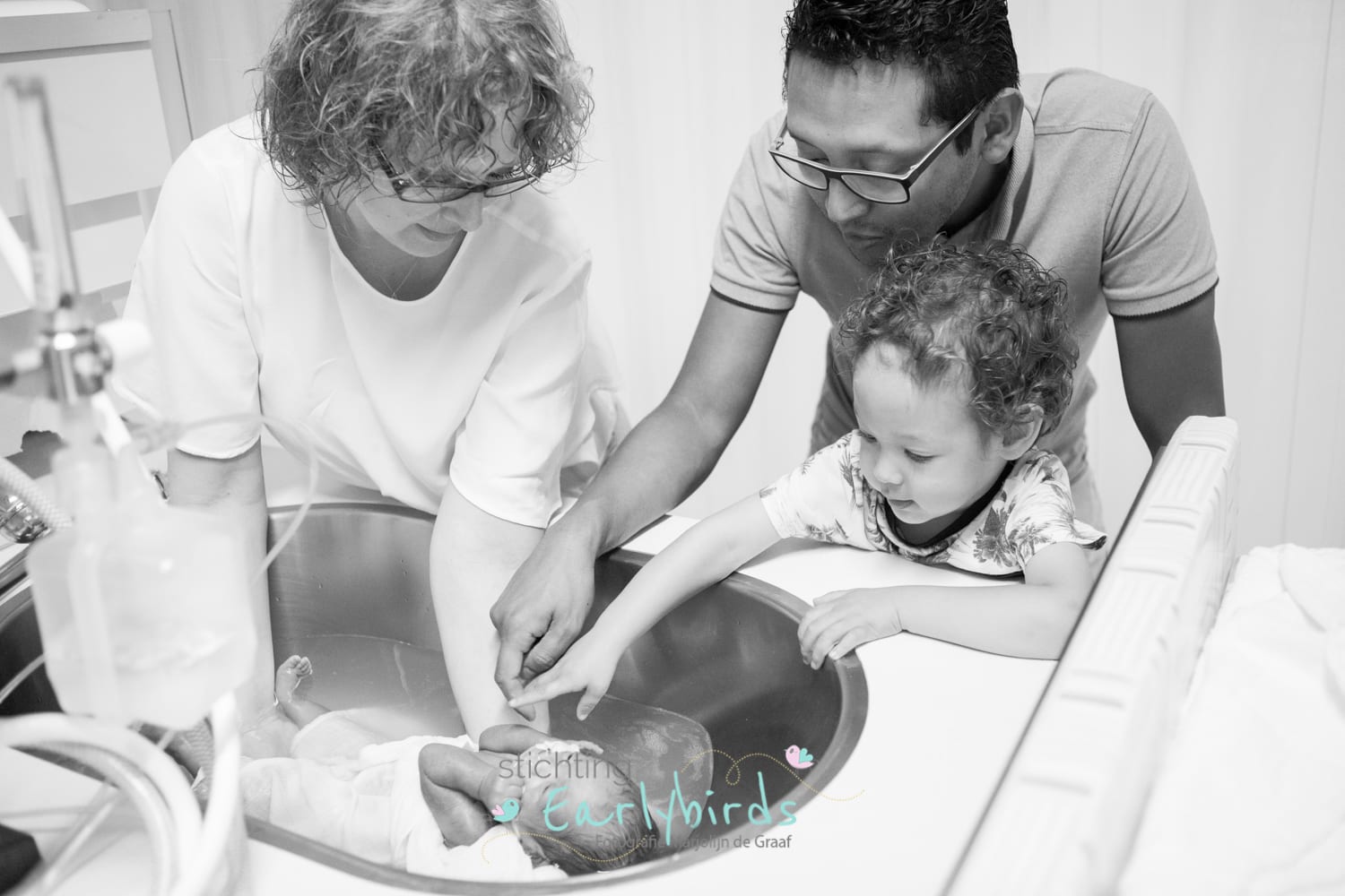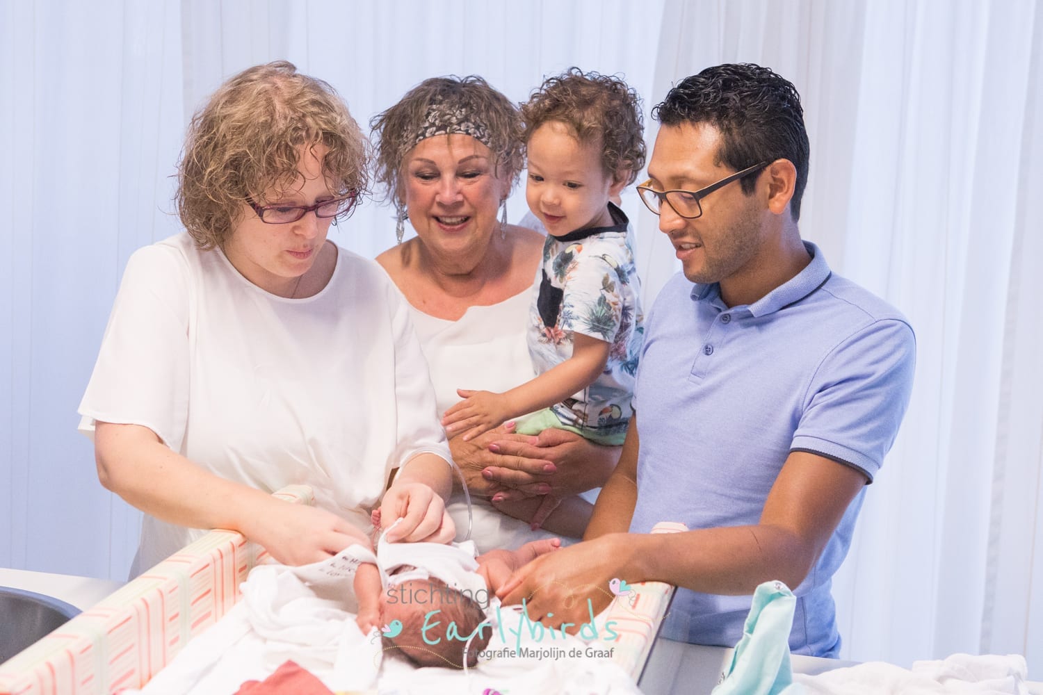 Hij wordt direct in een plastic zak gedaan, en we grappen nog dat dit natuurlijk niet de manier is om een pasgeboren kindje te verwelkomen op de wereld. Al dient het een heel goed doel, ter voorkoming dat hij teveel warmte verliest. Hij ademt zelfstandig en doet het wonderbaarlijk goed met een Apgar score van 6 en na 10 minuten 9.
