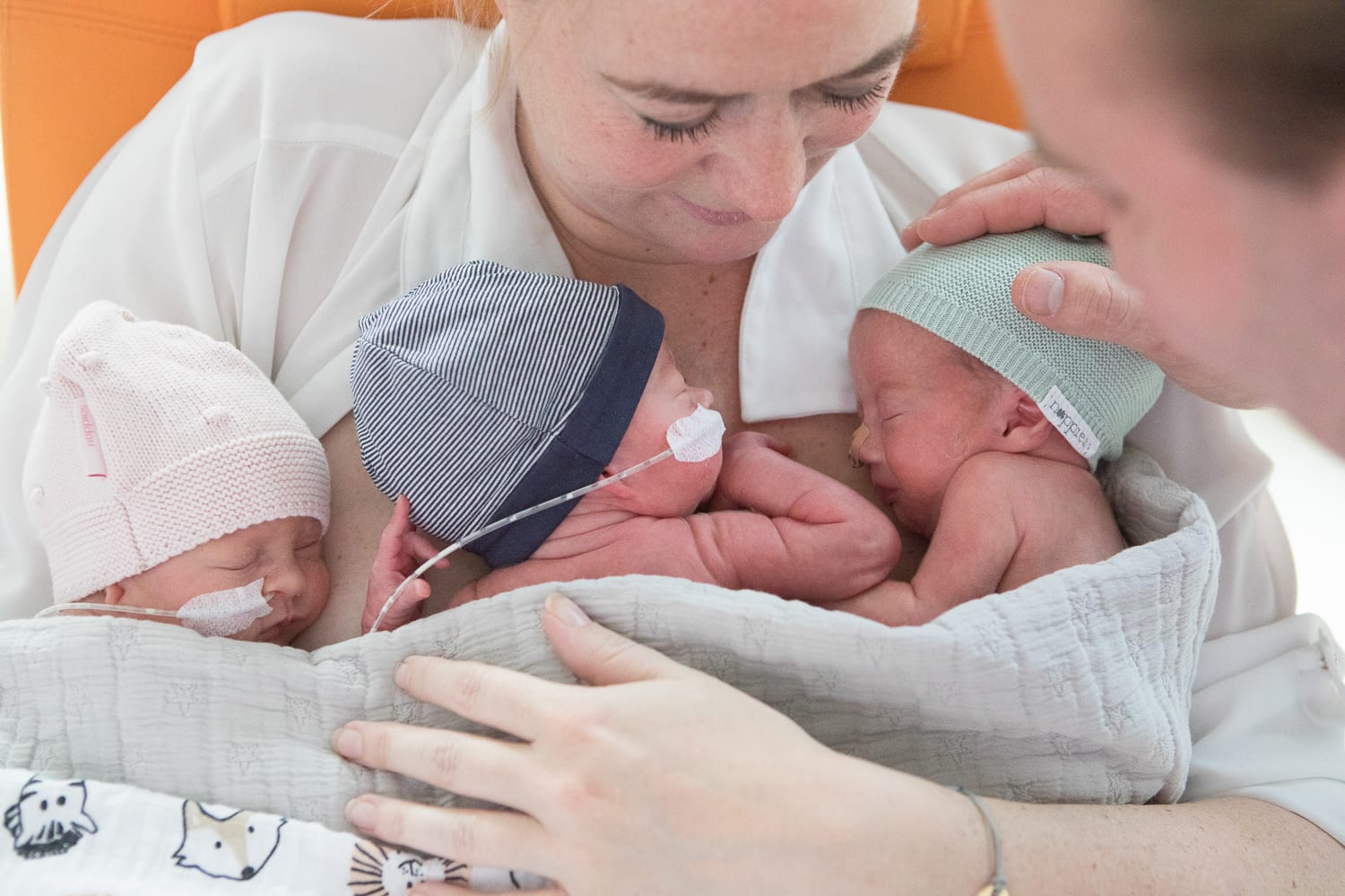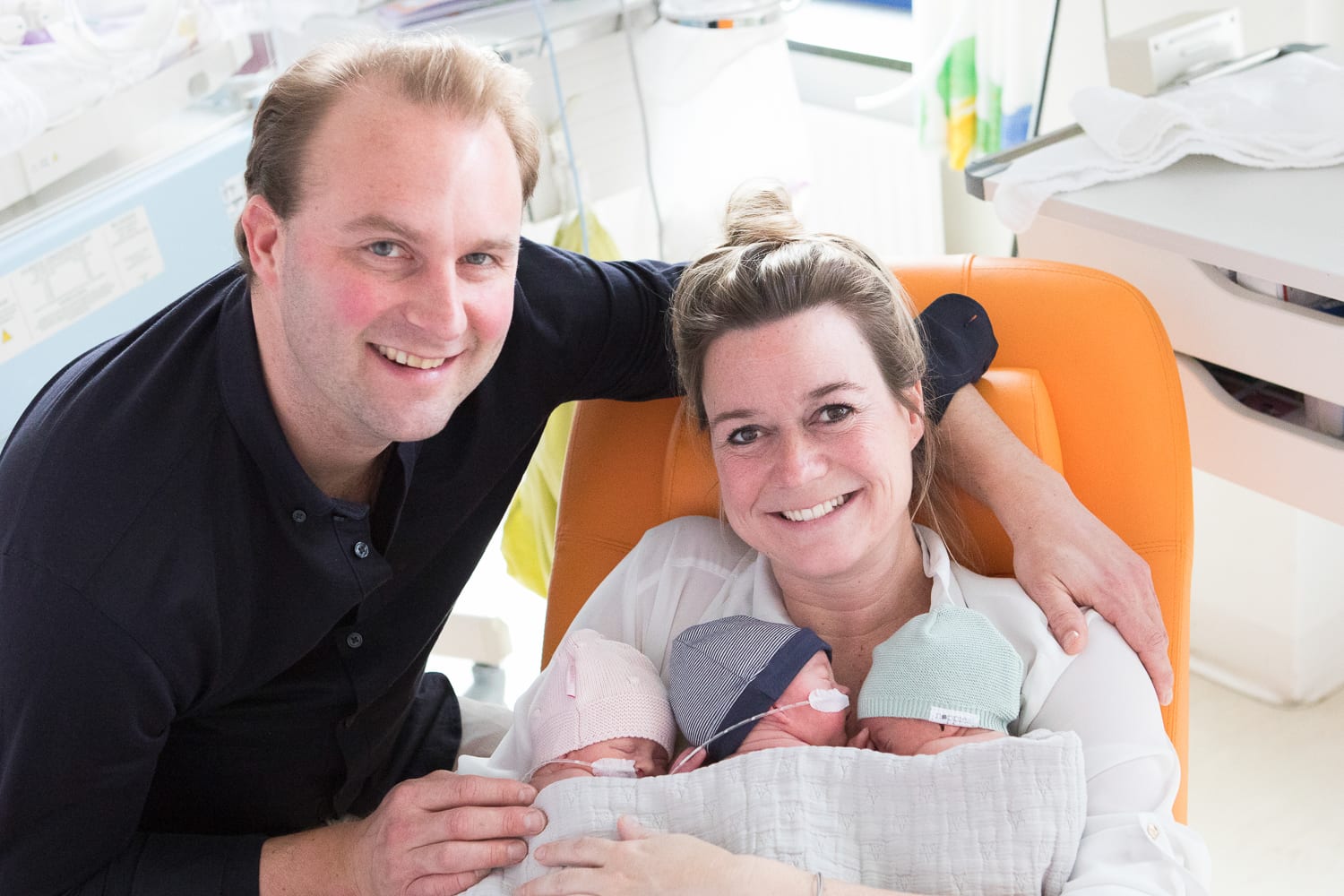 Aangekomen in het Tergooi ziekenhuis, leek het of de hele afdeling van hen was, 3 couveuses naast elkaar, wat een rijkdom voor deze ouders. Het viel mij meteen op dat de baby’s echte knapperds zijn, twee meiden en een stoere knul. Je kunt vaak te vroeggeboren baby’s aan het uiterlijk wel herkennen, prematuren hebben vaak hetzelfde koppie qua vorm, maar deze baby’s hadden dat echt niet. Vooral de meiden waren goed uit elkaar te houden, want ze scheelde behoorlijk wat in lichaamsgewicht. Mama heeft maar mooi de drieling tot 32 weken en 6 dagen kunnen dragen, Terwijl zij al ongeveer twee en halve week in het ziekenhuis verbleef. Werden zij op 2de kerstdag toch nog onverwachtse via keizersnede geboren. Het jongetje vertoonde een paar dipjes op zijn CTG als gevolg van een slechtere doorbloeding van de navelstreng. Hier wilden de artsen geen enkel risico mee nemen. De drieling is trouwens niet in het Tergooi geboren maar in het Diakonessenhuis in Utrecht.