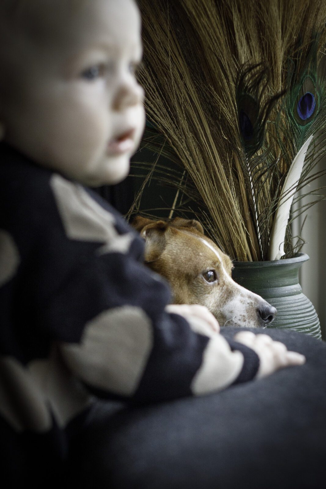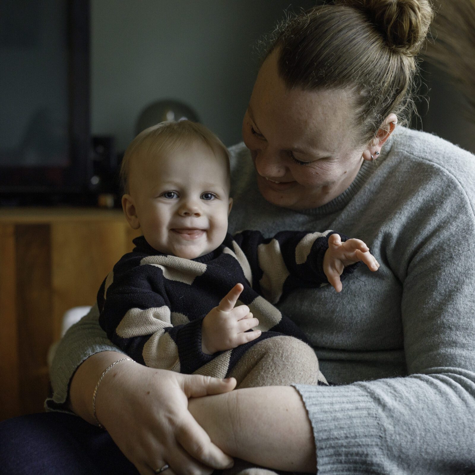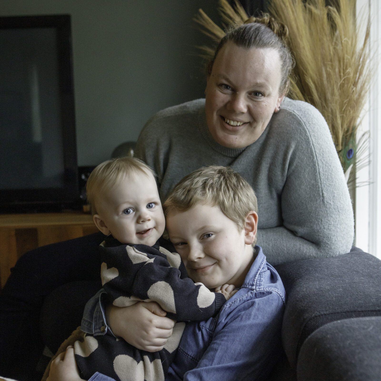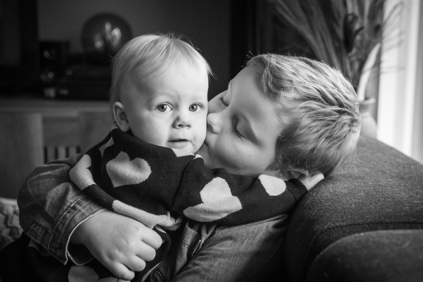 Toen we de koffie op hadden en Marjolijn haar camera uit de tas verscheen, was er veel spanning, bij mij, bij onze zoon van toen 7 jaar, en bij mijn vriend. Marjolijn had dat gelijk door! ‘Als jij Corianne nog even een schone luier geeft, kijk ik even naar het licht’ Oke… Zo gezegd zo gedaan. Ik geef Corianne een schone broek, pak haar weer op en knuffel nog even lekker met haar. Klik, klik, klik, Marjolijn ging lekker los! Voor ik het wist zat ik, zonder spanning, in de shoot! Ik had van tevoren van alles bedacht, maar niet dat het zo relaxed zou zijn! “Doe gewoon je ding, ik ben er niet”. Grappig, dan ineens kan het heel comfortabel zijn om voor de camera te staan. Gewoon lekker kletsen met Marjolijn. Knuffelen en spelen met Corianne en Dylano.