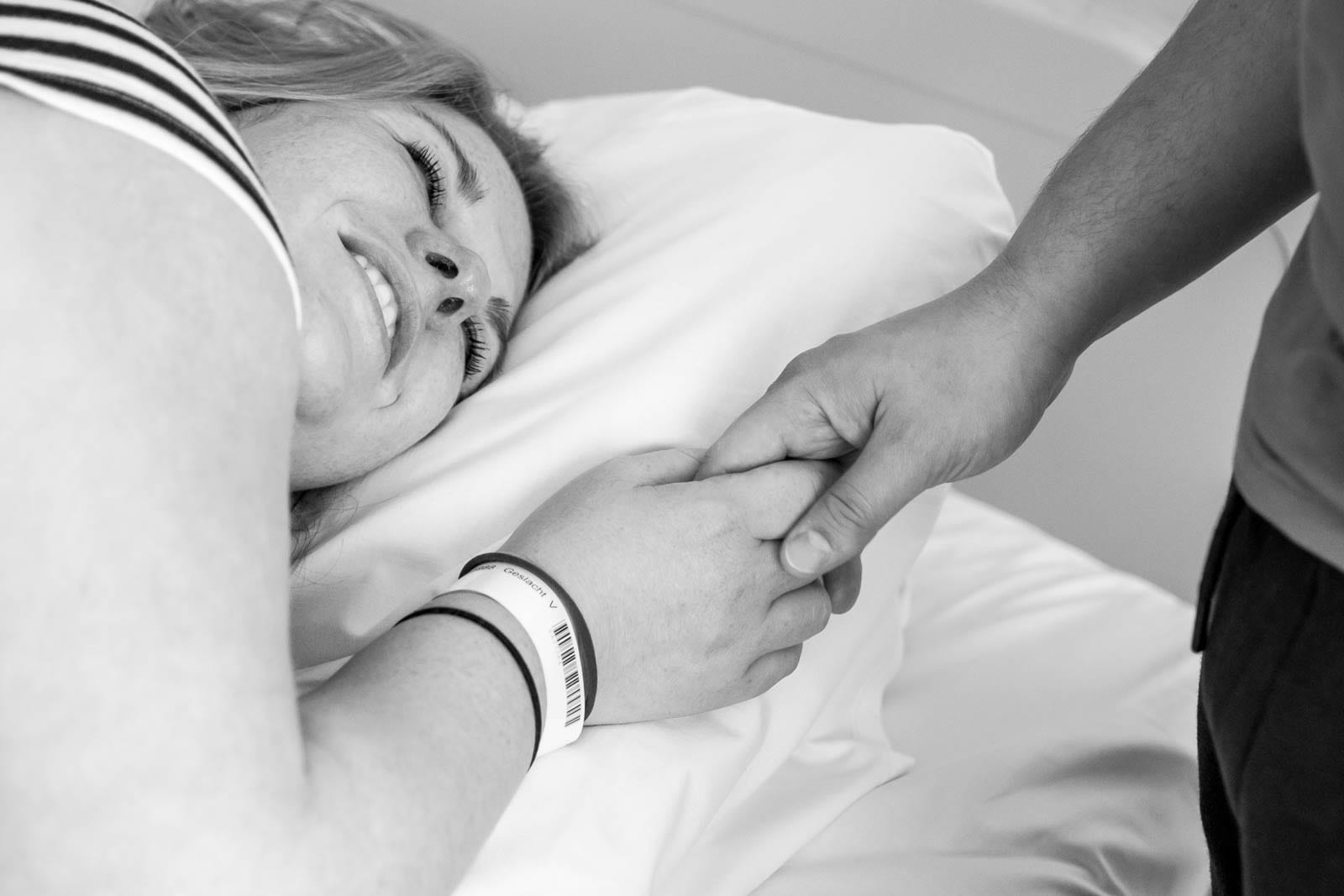 Dit moment is voor een geboortefotograaf vaak een lastig momentje die moeilijk in te schatten is. Het is hun eerste kindje, dus een geschiedenis over eerdere bevallingen is er niet, de vliezen zijn gebroken, daarna kan het snel gaan, maar niet altijd. Ze heeft ongeveer 4 cm ontsluiting, maar nog geen weeën. Ik heb 4 weken gewacht op deze dag, deze dag staat al helemaal in het teken van deze geboorte, die ik dus echt niet wil missen, dus ik besluit om al naar het ziekenhuis te gaan. Deze dag doen we samen!