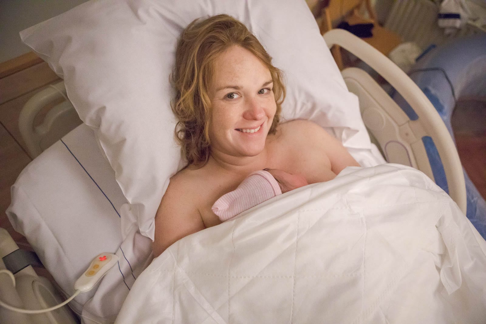 Om kwart over 9 stelt Marjolijn voor om alvast naar het ziekenhuis te komen, dat is wat eerder dan normaal bij de geboortefoto’s, maar anders zit ze toch ook thuis maar te wachten. En na zoveel weken en de onzekerheid rondom de corona maatregelen is het maar wat fijn dat ze kan komen! Het zal rond 10 uur geweest zijn dat Marjolijn binnenstapte. Even daarvoor waren mijn vliezen gebroken en was het infuus met weeënopwekkers aangesloten. Het werd meteen gezellig. Bijkletsen over de zwangerschap, het wachten en de laatste spannende dagen en ook hoe de vakantie in coronatijd voor Marjolijn en haar gezin is geweest. De eerste foto’s werden geschoten en Sander en ik kregen een vroege lunch, we hadden inmiddels ook wel trek gekregen!