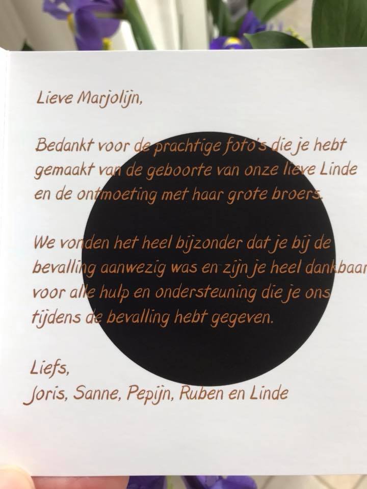Marjolijn, we zijn echt dolblij dat je bij deze momenten was en ik kan niet wachten tot het kraambezoek dat ik naast een beschuit met roze muisjes ook mijn geboorteboek kan aanbieden!!”
