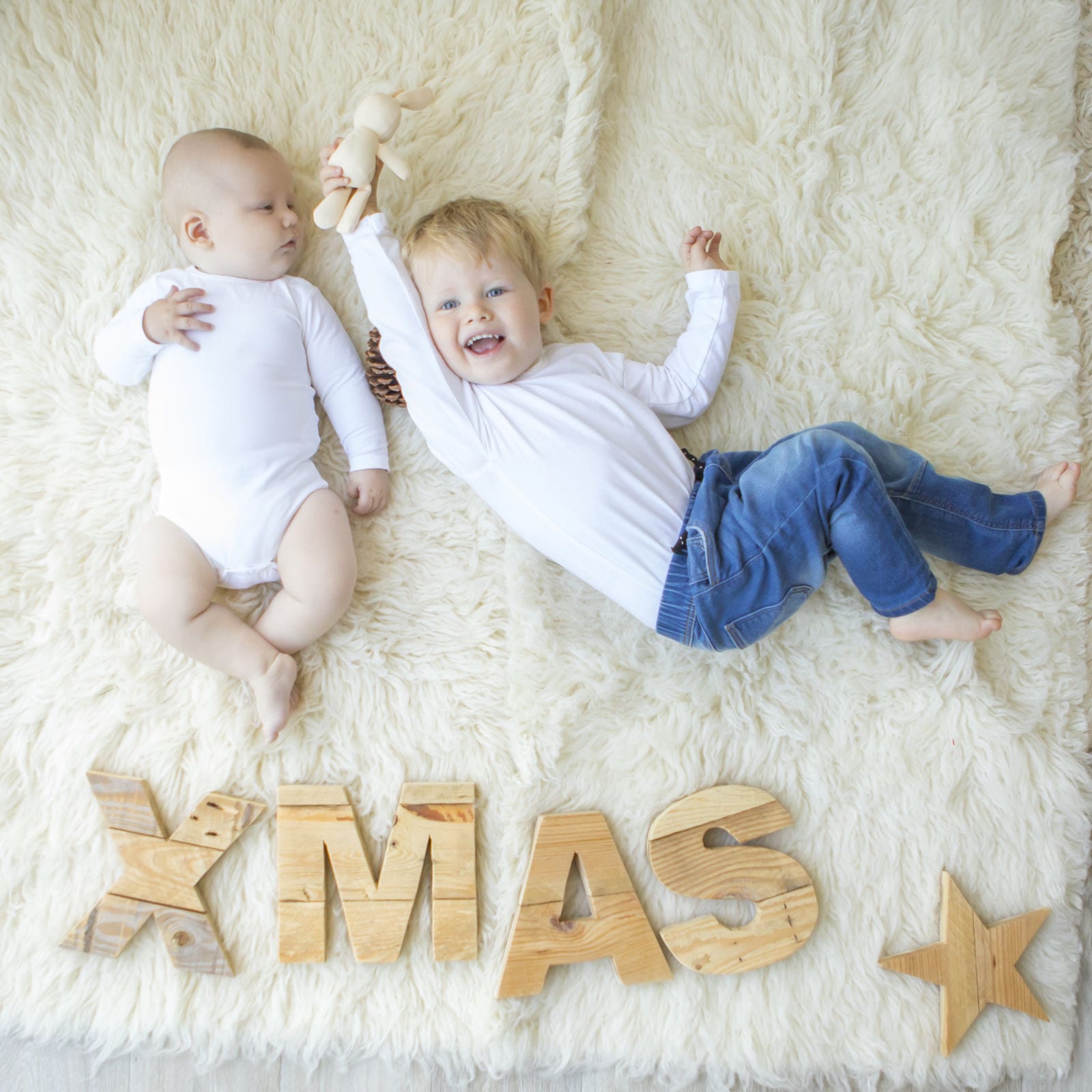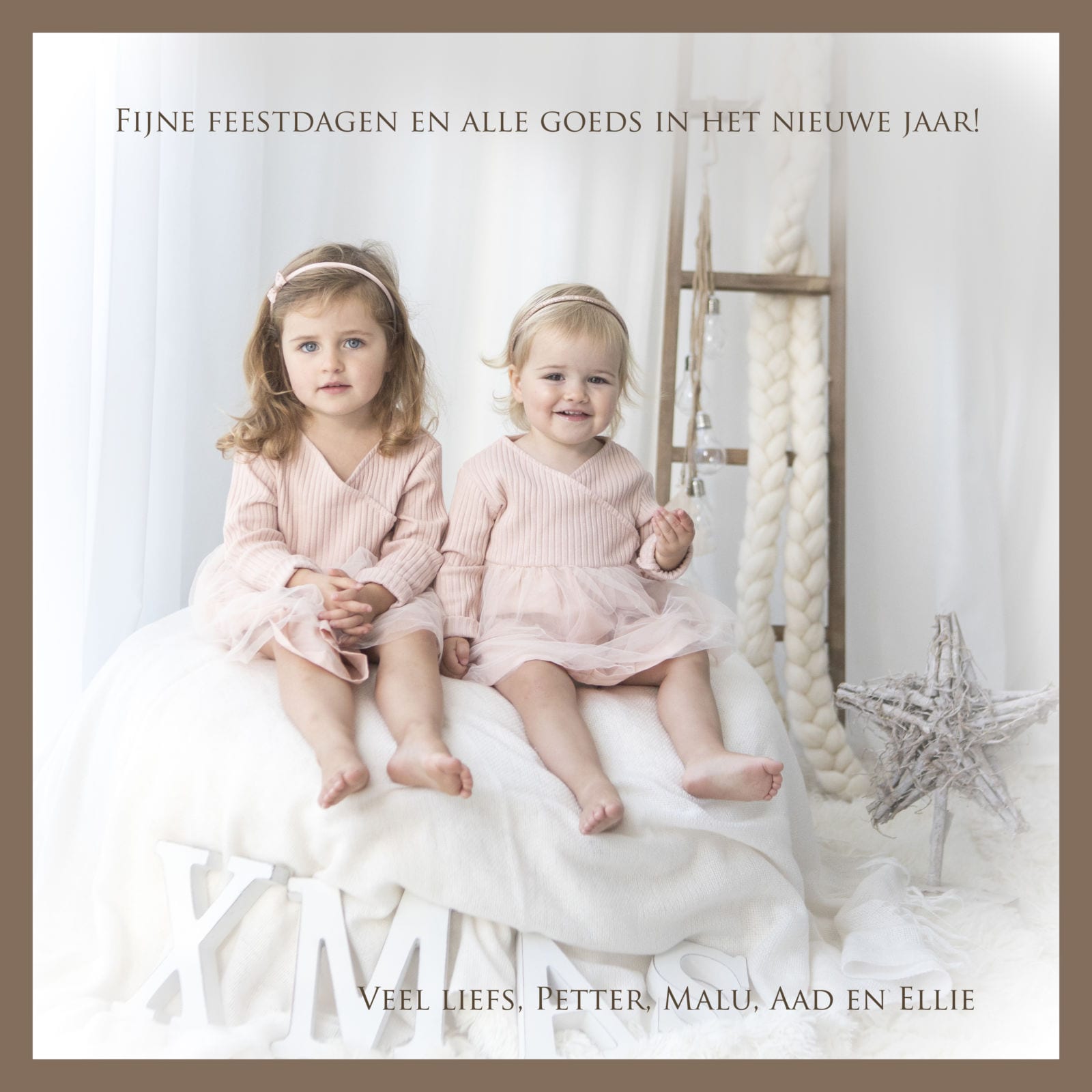 Daarom licht, fris, puur en liefdevol, romantische sfeer, met de focus op de lieve gezichtjes. Licht (room) witte setting, kleding wit of bijna wit, met alleen een kerstmuts. Superlief en schattig! Andere keuze is met lichte houten toevoegingen, onder andere de letters X-MAS deze zijn er in wit en hout en een houten trappetje en een houten ster. Helemaal puur natuur is ook een mogelijkheid.